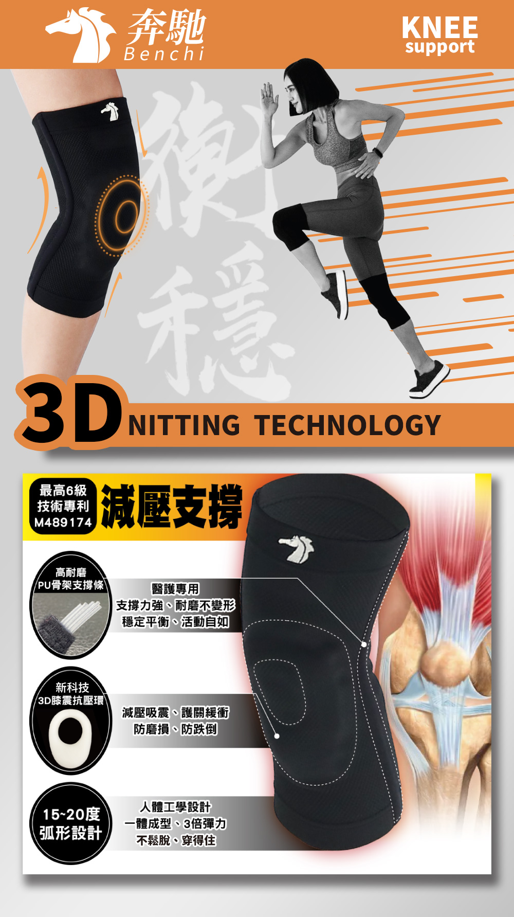 - PU骨架支撐條+3D膝震抗壓環